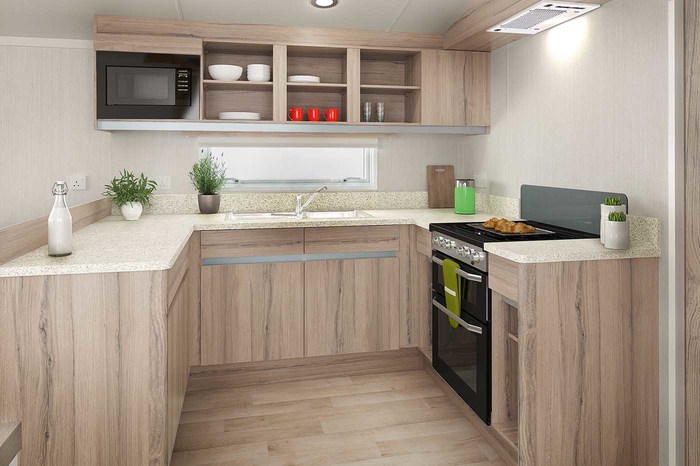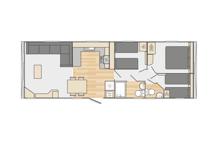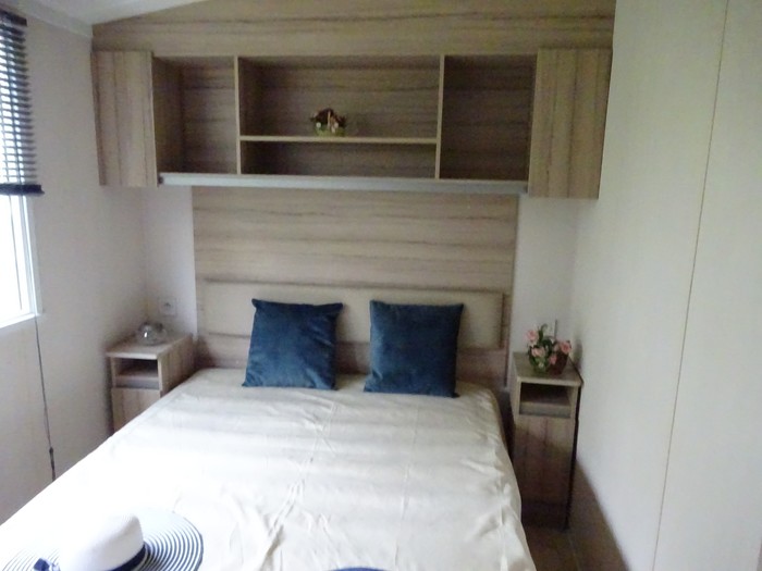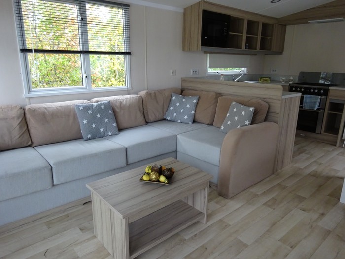 Swift Ardennes Bouwjaar 2019 3 slaapkamers afmetingen 11 x 3,7m Badkamer met douche en toilet 2de toilet Dubbelglas Centrale verwarming Inbouw koel-vries combinatie Inbouw magnetron Vinyl door de hele Chalet